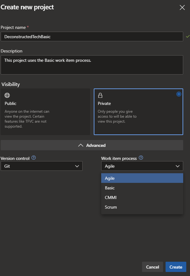 Once you sign up, you’ll be greeted with your organisational landing page and you’ll be prompted to create a new project. You’ll need to give a name and optionally a description. Next, you’ll need to select whether you want it to be a private or public project. Private projects mean you can specify who you want to have access to a project, while public projects are visible to anyone (which may be useful if you’re creating open-source software and are interested in having anyone contribute to your project). We’re selecting Private for this one. Next, you’ll need to specify a version control method; as we’re doing this just for planning rather than code management, leave it on the default of Git. Finally, you need to select a work item process. Azure Boards comes with four process templates for managing work: Basic (currently in Preview), Scrum, Agile and CMMI. In this example, we’ll make use of the Basic work item process to make it easier to get going.