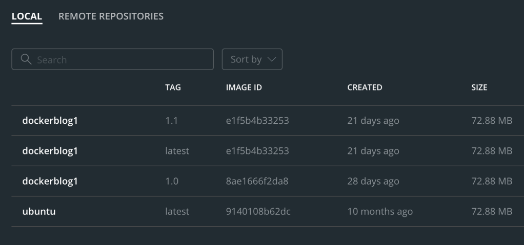 Now I’ve got three entries in the list for dockerblog1, all with different tags. dockerblog1 with the tag 1.1 and latest have the same Image ID, because I’ve not changed anything inside the image; I’ve just added an extra tag.